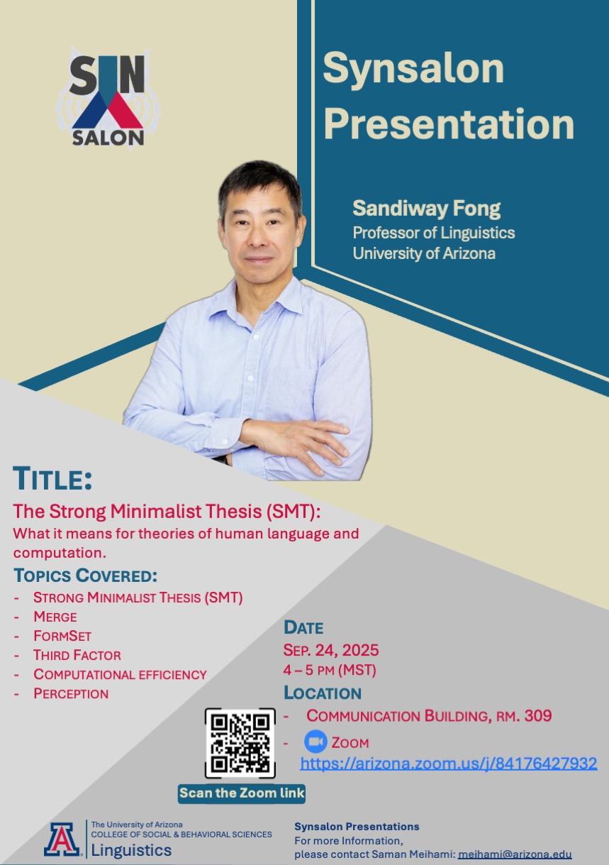 The Strong Minimalist Thesis (SMT): what it means for theories of human language and computation, Fong, S. Sept 24, 2025. 4-5pm, Communications 309, University of Arizona. Abstract Slides (1-33 pages): (here) |
