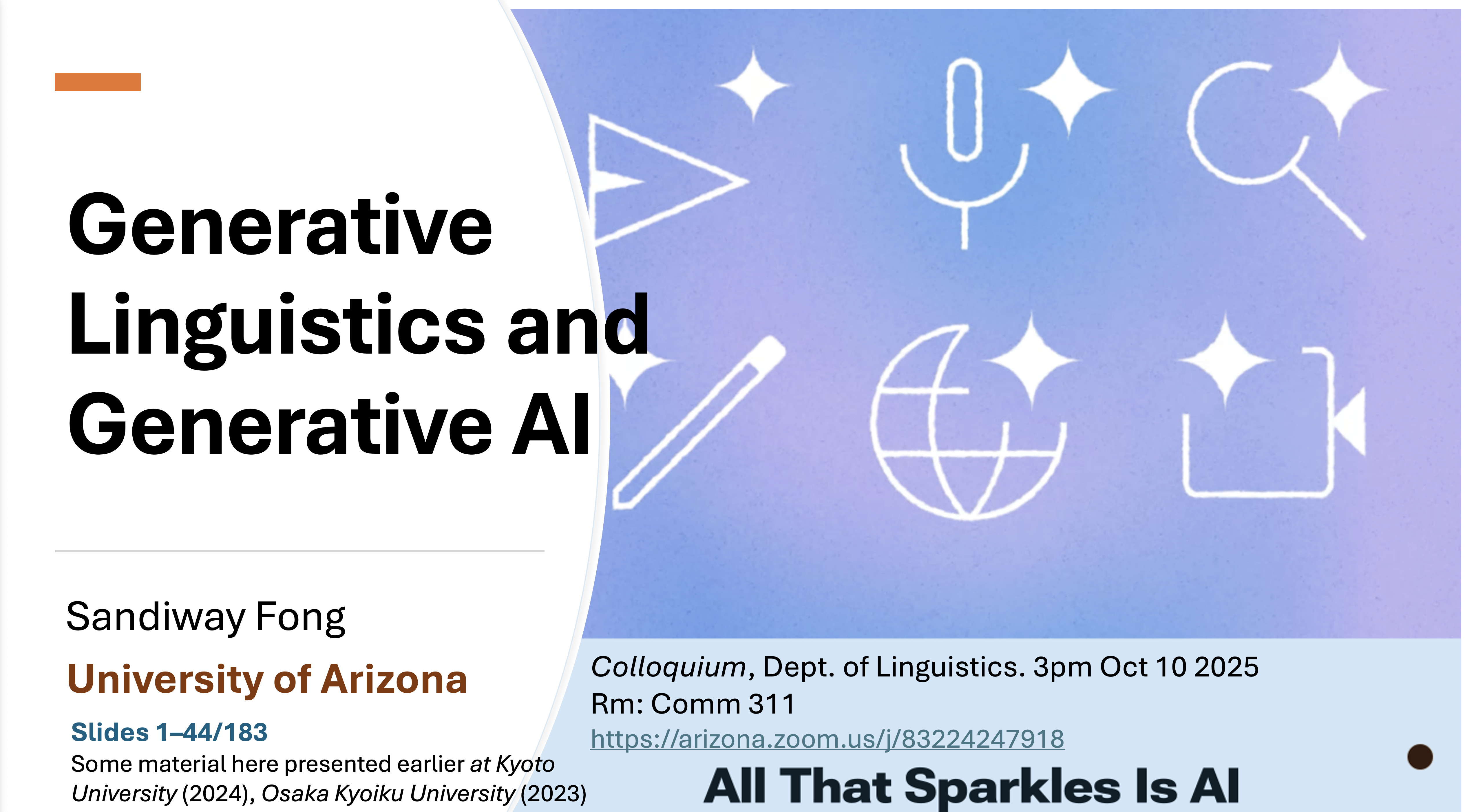 Generative Linguistics and Generative AI, Fong, S. Oct 10, 2025. 3-4:30pm, Communications 311, University of Arizona. Abstract Slides (1-44 pages): (here) |