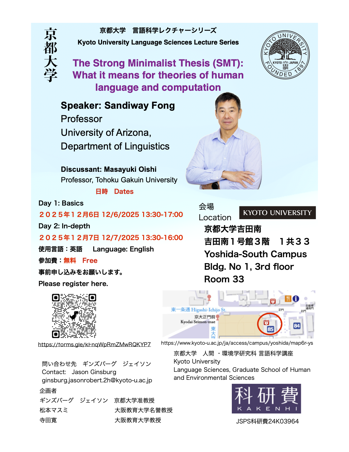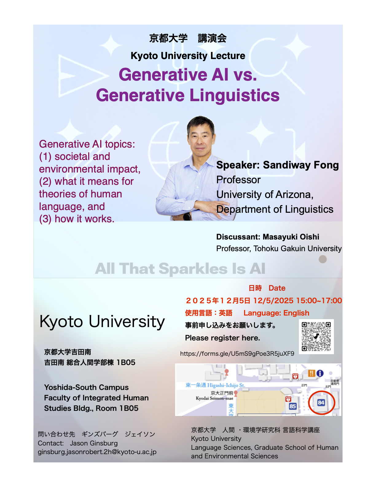 Dec 5th: 3-5pm Generative AI vs. Generative Linguistics. Fong, S. Yoshida-South Campus, Faculty of Integrated Human Studies Bldg., Room 1B05 Abstract: here UPCOMING TALK: Dec 6th 1:30-5pm: The Strong Minimalist Thesis (SMT): What it means for theories of human language and computation. Part 1: Basics. Fong, S. Dec 7th 1:30-4pm: Part 2: In-depth. Kyoto University Language Sciences Lecture Series. Yoshida-South Campus, Bldg. No 1, 3rd floor Room 33. Abstract: here |